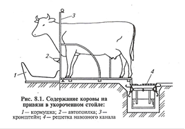 Наиболее широкое распространение имеет привязное содержание молочного скота в сочетании с различными вариантами механизации отдельных технологических операций. На фермах с привязным содержанием коров размещают в стойлах на привязи. Ряды стойл вдоль коровника оборудуют кормовыми и навозными проходами. Для удобства применения мобильных кормораздатчиков стойловое оборудование размещают так, чтобы коровы находились с двух сторон кормового прохода головами друг к другу. В двухрядном коровнике навозные проходы предусматривают у стен, а в четырехрядном - два навозных прохода у стен и один (центральный) посередине.
