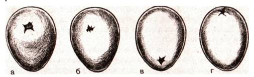 Просвечивая яйца на овоскопе, следует обращать внимание и на расположение желтка. Он должен находиться посередине яйца, не примыкая ни к одной из сторон. При вращении яйца вокруг продольной своей оси желток, отклоняясь в сторону вращения, по окончании вращения должен возвращаться в прежнее положение. В противном случае произойдет обрыв градинок, удерживающих желток яйца в центральном положении, предотвращая его прилипание к подскорлупной оболочке в период инкубации. При просвечивании яйца на овоскопе обращают внимание и на структуру скорлупы. Она должна быть однородной, без «мраморности».