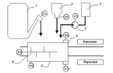 Рисунок 1.1 – Технологическая схема линии раздачи корма в свинарнике: 1 — запарник-питатель картофеля; 2 — дозатор-питатель концкормов; 3 — емкость для обрата; 4 — раздатчик-смеситель кормов; 5 — выгрузное устройство; 6 — мешалка; 7 — насос; М5 — привод кормораздатчика (кормораздатчик на рисунке показан в плане).