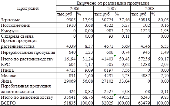 Рассмотрим структуру товарной продукции в ООО «Агрофирма» в 2006 – 2008 гг в таблице 1.4.