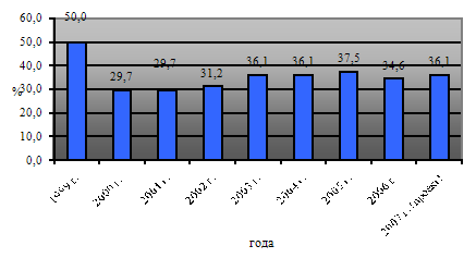 За восьмилетнюю практику НДС, как видно из рисунка, тенденция снижения роли налога на добавленную стоимость в формировании бюджетов всех уровней превратилась в устойчивую закономерность. С 1999 г. доля НДС в общей сумме бюджетных доходов снизилась на 13,89%, а в общей сумме налоговых доходов - на 9,81%. [21, с.40]