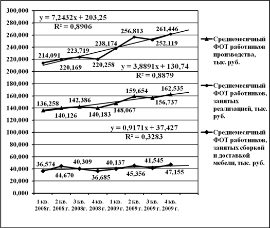 На основании расчетов мы видим, что в 1 квартале 2010 года среднемесячный ФОТ по всем видам деятельности может возрасти. Наибольшее значение оплаты труда ожидается у работников, занятых реализацией мебели (268,439 тыс. руб.). У работников, занятых производством мебели, оплата труда может возрасти до165,742 тыс. руб., а у рабочих по сборке и доставке мебели – до 45,681 тыс. руб. ООО «МС-компании» следует приложить усилия к тому, чтобы разрыв между оплатой труда работников разных видов деятельности уменьшился, в частности, заботиться о повышении квалификации работников.