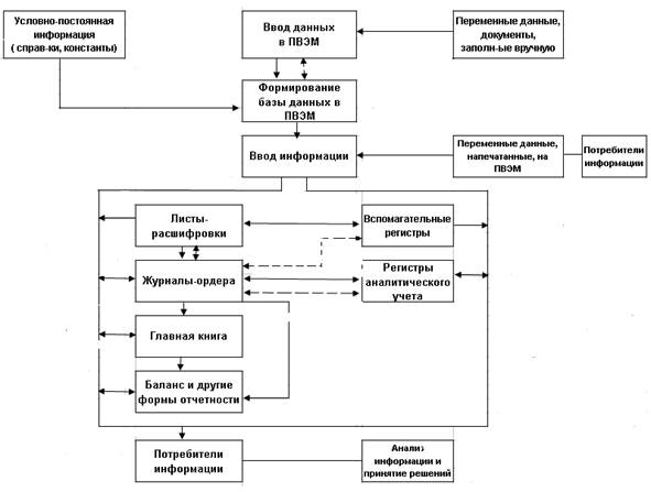 Не нарушая основные принципы ведения учета при журнально-ордерной форме счетоводства возможно получение на компьютерах привычных для бухгалтера регистров аналитического и синтетического учета с небольшими изменениями их внешней формы. В частности, вместо пронумерованных и прошнурованных книг печатаются отдельные пронумерованные листы, собираемые в конце месяца или года в книги, переставляются отдельные графы в ведомостях, совмещаются два регистра в одном печатном бланке и пр. Определенные изменения происходят и в технологии компьютерной обработки учетных данных — совокупности периодически повторяющихся взаимосвязанных человеко-машинных операций, начиная от создания первичного бухгалтерского документа и заканчивая составлением накопительных и группировочных регистров синтетического и бухгалтерского учета.