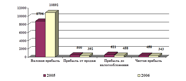 (в) за 2006г. чистая прибыль ООО «Водоканал-сервис» составила 343 тыс. руб., что на 115 тыс. руб. меньше, чем за 2005г. Удельный вес чистой прибыли предприятия в выручке снизился на 0,62% и составил в отчетном периоде 0,42%. Темп снижения показателя – 74,89%.