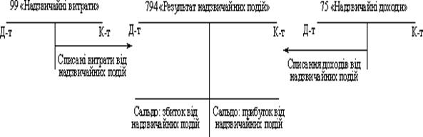 Як уже зазначалось, для обліку надзвичайних доходів і витрат призначені рахунки 75 та 99. Порівняння залишків сум цих рахунків здійснюється на субрахунку 794 «Результат надзвичайних подій», що дає змогу визначити фінансовий результат від надзвичайних подій. На кредит цього субрахунку в кореспонденції з дебетом рахунка 75 «Надзвичайні доходи» списують доходи, одержані від надзвичайних подій (суми відшкодованих збитків від надзвичайних подій), а на дебет (у кореспонденції з кредитом рахунка 99 «Надзвичайні витрати») — втрати від надзвичайних подій (втрати від стихійного лиха, техногенних катастроф, аварій, пожежі тощо).