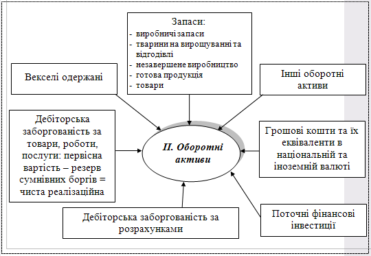В II розділі активу балансу "Оборотні активи" узагальнюється інформація про високоліквідні активи, даний розділ активу містить такі статті: запаси, векселі одержані, дебіторська заборгованість за товари, роботи, послуги, дебіторська заборгованість за розрахунками, інша поточна дебіторська заборгованість, поточні фінансові інвестиції, грошові кошти та їх еквіваленти, інші оборотні активи.