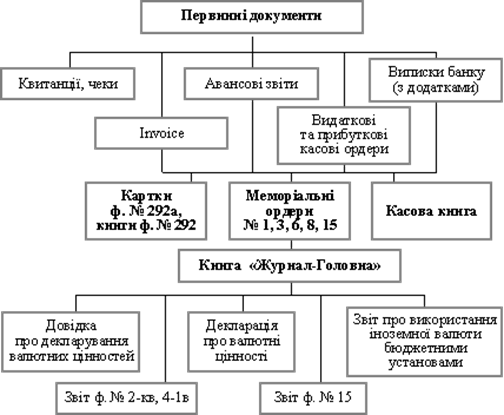 Бухгалтерський облік операцій у іноземних валютах ведеться в тій самій системі рахунків, що й облік операцій у гривнях. Записи по рахунках розрахунків з постачальниками і підрядчиками, покупцями і замовниками та іншими дебіторами і кредиторами здійснюються відповідно на рахунках 36 «Розрахунки з покупцями і замовниками») 63 «Розрахунки з постачальниками і підрядчиками», 64 «Розрахунки за податками й платежами» та ін. При цьому можливе відокремлення розрахунків в іноземних валютах на окремих субрахунках, що відкриваються в складі відповідних синтетичних рахунків. У облікових регістрах обов’язково вказують дату здійснення господарської операції, оформленої відповідним документом.