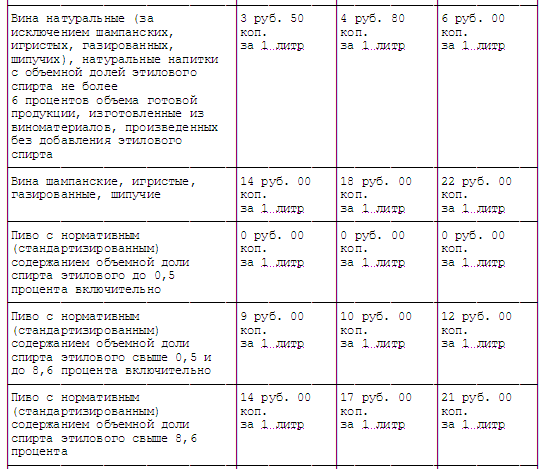 Например, в случае, если нормативное (стандартизированное) содержание объемной доли этилового спирта составляет свыше 0,5 и до 8,6 процента включительно, ставка акциза равна 1,91 руб. за 1 литр.