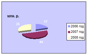 Как видно из рисунка прибыль в 2007году по отношению к 2006 г. возросла на 27 млн. руб. Однако в 2008 году организации не удалось увеличить прибыль от реализации, а наоборот снизить ее на 19 млн. руб.