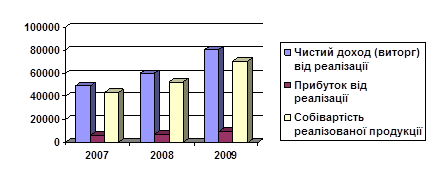 За результатами порівняльного аналізу показників видно, що чистий дохід (виручка) від реалізації (ф. 2 ряд. 035) в 2008 році збільшилася в порівнянні з 2007 роком на 10630,6 тис. грн., в 2009 році збільшилась в порівнянні з 2008 роком на 20597,3 тис. грн., чи на 34,39%. Валовий прибуток підприємства в 2009 році виріс у порівнянні з 2008-м на 2427,4 тис. грн., чи на 33,31%. Валовий прибуток підприємства в 2008 році виріс у порівнянні з 2007-м на 1359,2 тис. грн. Собівартість реалізації при цьому в 2009 році збільшилася на 18169,9 тис. чи на 34,53% у порівнянні з 2008-м. В 2008 році порівняно з 2007-м собівартість виросла на 9271,4 тис. грн. Зобразимо графічно залежність цих показників (рис. 1.1):