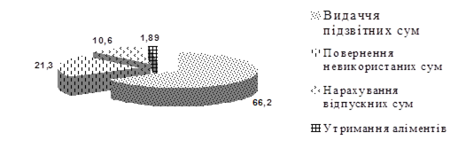 досліджено структуру і динаміку видачі та повернення не використаних підзвітних сум, виплати відпускних та утримання аліментів;