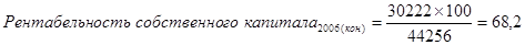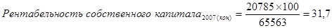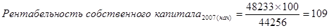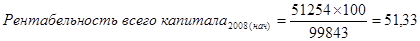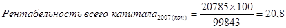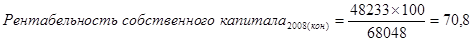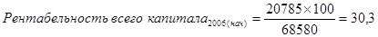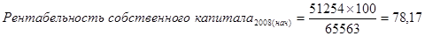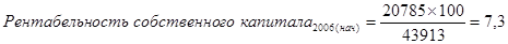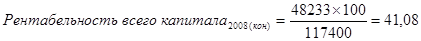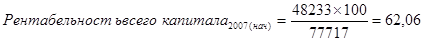 Целесообразно рассчитать показатели рентабельности всего капитала и собственного капитала. Особое внимание следует уделить показателю рентабельности собственного капитала, характеризующего, процент собственного капитала сформированного СПК "Рассвет" за анализируемый период за счет чистого притока денежных средств от текущей деятельности. Из расчётов видно что, рентабельность собственного капитала в 2006 году – 7,3; 68,2; 2008 году на начало 78,17 на конец периода 70,8. На это повлияло снижение чистого денежного потока от текущей деятельности.