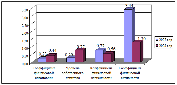 Коэффициент финансовой автономии и уровень собственного капитала за рассматриваемый период повысились на 0,21 и 0,48 соответственно, но значения все равно не соответствуют рекомендуемым. Коэффициент финансовой зависимости за рассматриваемый период уменьшился на 0,21, что говорит о снижении зависимости предприятия от внешних кредиторов и инвесторов и расценивается положительно, но показатель превышает рекомендуемое значение. Соответственно наблюдается снижение за анализируемый период значения коэффициента финансовой активности. Коэффициент покрытия внеоборотных активов собственным капиталом и коэффициент обеспеченности оборотных активов собственными средствами за анализируемый период имеют тенденцию к повышению и уже с 2008 года соответствуют рекомендуемым.