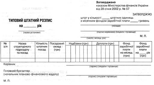 Уніфікованої форми ШР не існує . Однак у бюджетній сфері, де всі витрати (зокрема, й на оплату праці) регламентовано, така форма є. Й для бюджетників ШР обов'язковий. Затверджено її наказом Мінфіну від 28.01.02 р. № 57. І, що примітне, незважаючи на свою бюджетну спрямованість, вона (з незначними коригуваннями) підійде для потреб будь-якого, у тому числі і небюджетного, роботодавця. Адже в ній передбачено майже всі ті обов'язкові реквізити ШР, про які ми говорили в № 53 за 2005 рік.