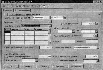 Документ складається із заголовку і табличної частини документа. У заголовку документа вводиться інформація з лікарняного листа. Таблична частина документа призначена тільки для автоматизації розрахунку суми, нарахованої за лікарняним листом. За допомогою табличної частини можна розрахувати середньоденну суму заробітної плати співробітника за кількість місяців, що задана в константі Колличество месяцев для больничного . Таблична частина заповнюється автоматично. Дані щодо нарахування (реквізит Сумма ) можуть мати нульові значення, якщо за ці періоди нарахування зарплати не проводилися. У цьому випадку можна вручну розрахувати і внести суму, нараховану за лікарняним листом, або ввести значення нарахованої зарплати за зазначені періоди в табличну частину документа. При проведенні документ формує проводки з нарахування суми лікарняних. Проводки щодо перерахунку прибуткового податку буде робити документ Начисление ЗП .