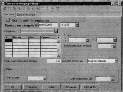 За допомогою документа Отпуск можна здійснити розрахунок суми відпускних і провести нарахування цієї суми по обраному співробітнику.