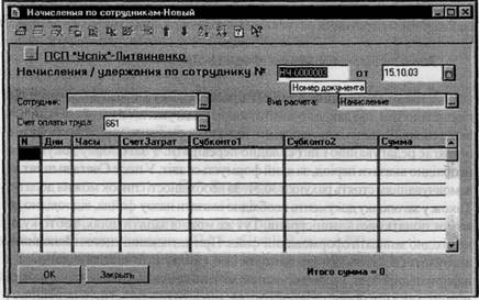 Документ Начисление. Человек призначений для внесення всіх нарахувань, утримань по співробітнику, що були зроблені в поточному місяці. У заголовку необхідно вказати співробітника, для якого будуть зроблені нарахування, утримання.
