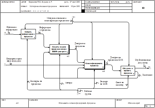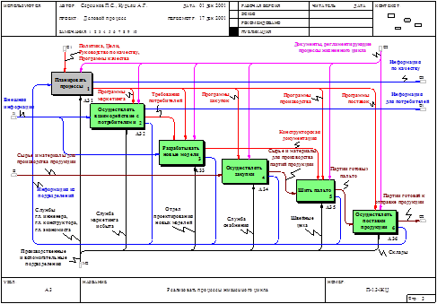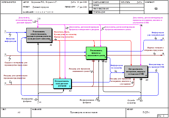 | Раздел 7 Процессы жизненного цикла | На диаграмме этого уровня детализации этот процесс представлен в неявном виде в рамках процесса А3 «Реализовать процессы жизненного цикла». Входы А3. «Внешняя информация», «Сырье и материалы для производства продукции», «Политика, цели, руководство по качеству, программы качества», «Документы, регламентирующие процессы жизненного цикла», «Ресурсы для процессов жизненного цикла». Выходы А3. «Партии готовой к отправке продукции», «Информация для потребителей» (о качестве), «Информация по качеству» (внутренняя информация) |