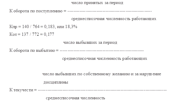 1 Состояло по списку на начало года2 Принято всего: в т.ч.а) по организованному наборуб) по направлениям из числа, окончивших учебные заведенияв) переведено с других предприятийг) принято самим предприятием3 Выбыло всего: в т.ч.а) переведено на другие предприятияб) в связи с окончанием срока договорав) в связи с уходом в армию, на пенсиюг) уволено по собственному желаниюд) уволено за прогулые) переведено из рабочих в другие категории4 Состояло по списку на конец периода5 Число рабочих, совершивших прогул6 Число случаев прогулов7 Среднесписочная численностьПоказатели движения персонала рассчитываются следующим образом: