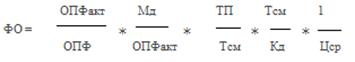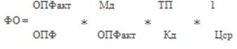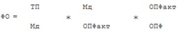 Для увеличения фондоотдачи темпы роста объема производства должны быть выше темпов роста стоимости основных производственных фондов, а темпы роста производительности труда выше темпов роста фондовооруженности.Для более детального анализа фондоотдачи делается поэтапное преобразованиеисходной формулы.1 этап: в формулу расчета фондоотдачи вводится стоимость активной части (ОПФакт): ТП ОПФакт ТП ОПФактФО = ∗ = ∗ОПФ ОПФакт ОПФакт ОПФ В результате получены показатели: фондоотдача с рубля активной части основных фондов и доля активной части в величине всех основных производственных фондов. В ходе дальнейшего анализа можно рассчитать влияние каждого из этих факторов на общий показатель фондоотдачи и определить направления его повышения за счет, во-первых, улучшения использования оборудования (активной части основных фондов), а во-вторых, за счет улучшения структуры основных фондов – повышения доли их активной части.2 этап: использование для преобразования формулы, полученной на 1 этапе, показателя стоимости действующего оборудования. Формула расчета фондоотдачи имеет вид: