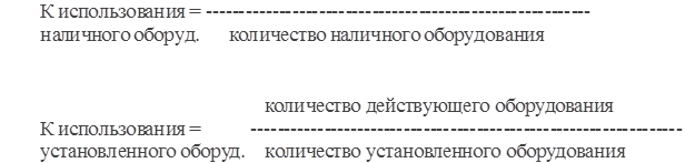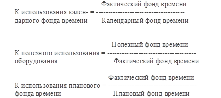 В результате такого анализа принимаются решения о необходимости замены, модернизации или ремонта оборудования по каждой технологической группе в конкретных подразделениях предприятия.Анализ экстенсивного использования оборудования (по времени) предполагает расчет фондов времени его работы: календарного, режимного, располагаемого, планового, фактического, полезного, а также соответствующих коэффициентов, например: