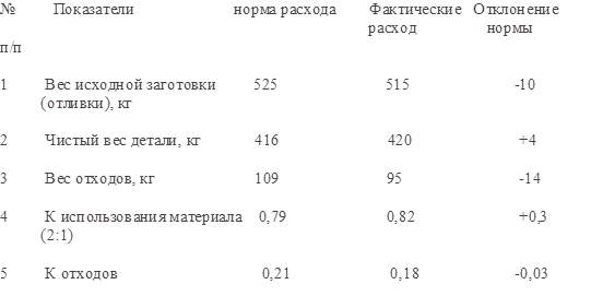 ТП – объем товарной продукции,МЗ – материальные затраты.Материалоотдача характеризует выпуск продукции с каждого рубля материальных затрат.Показателем, обратным материалоотдаче является материалоёмкость, которая характеризует величину материальных затрат, приходящихся на 1 рубль товарной продукции. Поскольку материальные затраты включают стоимость сырья и основных материалов, покупных изделий, топлива и энергии, то для более детального анализа следует рассчитывать частные показатели, например, топливоёмкость, энергоёмкость и другие. Рассчитанные показатели сопоставляют в динамике и с плановыми, выявляют отклонения и их причины. Особое внимание уделяется внешним факторам: изменениям цен, тарифов, условий транспортировки и другим. Из внутренних факторов необходимо исследовать состояние нормативной базы, то есть проанализировать прогрессивность норм расхода материалов по видам продукции и их выполнение.Рассчитанные отклонения показывают влияние факторов на изменение стоимости материалов.Более детальный анализ можно провести по конкретному виду материала:Анализ использования чугунного литья на изделие А