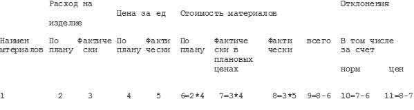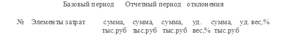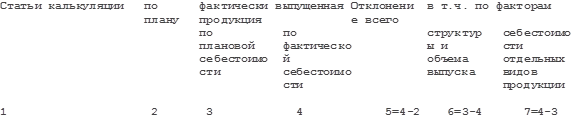 1 Материальные затраты2 Затраты на оплату труда3 Отчисления на социальныенужды4 Амортизация5 Прочие затратыИтого по элементам затратКлассификация затрат по статьям калькуляции позволяет проанализировать себестоимость как всей продукции, так и отдельных ее видов, выявить причины изменения, места и виновников перерасхода и непроизводительного расхода ресурсов.Перечень статей затрат жестко не регламентируется и определяется в каждой организации самостоятельно. Методика факторного анализа себестоимости товарной продукции в сравнении с плановой приведена в таблице 2.Более детальный анализ проводится по прямым статьям; для выявления влияния на изменение затрат фактора объема продукции плановая сумма корректируется на процент выполнения плана по объему товарной продукции; из полученной величины вычитается плановая сумма. Для расчета влияния фактора структуры продукции из суммы, полученной в графе 6 таблицы 2 нужно вычесть сумму влияния фактора объема продукции.Оценка прямых материальных затрат должна быть дополнена анализом отклонений по видам материалов, сырья, полуфабрикатов, топлива и энергии для выявления влияния факторов замены материалов и поставщиков, изменения доли покупных полуфабрикатов, норм расхода, цен, тарифов и других факторов. Таблица 2. Анализ затрат по статьям калькуляции товарной продукции, тыс. руб.