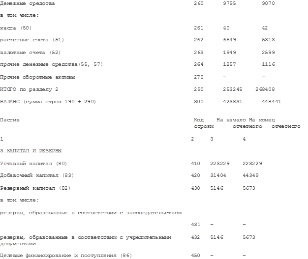2. АНАЛИЗ БУХГАЛТЕРСКОГО БАЛАНСА ОРГАНИЗАЦИИ 2.1 Содержание бухгалтерского баланса Финансовое положение любого экономического субъекта, самостоятельно ведущего учет, на конкретный момент времени отражает бухгалтерский баланс. Более конкретно бухгалтерский баланс отражает активы и пассивы (капитал и обязательства) организации на определенный момент времени.Согласно Положению по бухгалтерскому учету "Бухгалтерская отчетность организации" (ПБУ 4\99) в бухгалтерском балансе активы и обязательства должны представляться с подразделением в зависимости от срока обращения (погашения) на краткосрочные и долгосрочные. Активы и обязательства представляются как краткосрочные, если срок обращения (погашения) по ним не более 12 месяцев после отчетной даты или продолжительности операционного цикла, если он не превышает 12 месяцев. Все остальные активы и обязательства представляются как долгосрочные.Пример бухгалтерского баланса представлен в Приложении 1.Важнейшими статьями внеоборотных активов являются нематериальные активы, основные средства, незавершенные капитальные вложения, доходные вложения в материальные ценности и долгосрочные финансовые вложения.В соответствии с ПБУ 14/2000 к нематериальным активам относятся следующие объекты:- исключительное право патентообладателя на изобретение, промышленный образец, полезную модель;- исключительное авторское право на программы для ЭВМ, базы данных;- имущественное право автора или иного правообладателя на топологии интегральных микросхем;- исключительное право владельца на товарный знак и знак обслуживания, наименование места происхождения товаров;- исключительное право патентообладателя на селекционные достижения.В составе нематериальных активов учитываются также деловая репутация организации и организационные расходы.По статье "Основные средства" бухгалтерского баланса отражаются внеоборотные активы в виде зданий, сооружений, рабочих и силовых машин и оборудования, измерительных и регулирующих приборов и устройств, вычислительной техники, транспортных средств, инструмента, производственного и хозяйственного инвентаря и принадлежностей и других аналогичных объектов, используемых свыше 12 месяцев (ПБУ 6/01).По статье "Незавершенное строительство" показывается стоимость незаконченного строительства, осуществляемого как хозяйственным, так и подрядным способом.В качестве доходных вложений в материальные ценности в бухгалтерском балансе отражается имущество организации, имеющее материально-вещественную форму (здания, оборудование и др.), предоставляемые организацией за плату во временное пользование с целью получения дохода (аренда).К долгосрочным финансовым вложениям относят долгосрочные инвестиции в государственные и муниципальные ценные бумаги, ценные бумаги других организаций, в том числе долговые ценные бумаги, в которых дата и стоимость погашения определена (облигации, векселя); вклады в уставные (складочные) капиталы других организаций (в том числе дочерних и зависимых хозяйственных обществ); предоставленные другим организациям займы, депозитные вклады в кредитных организациях, дебиторская задолженность, приобретенная на основании уступки права требования, вклады организации-товарища по договору простого товарищества (ПБУ 19/02).В разделе "Оборотные 