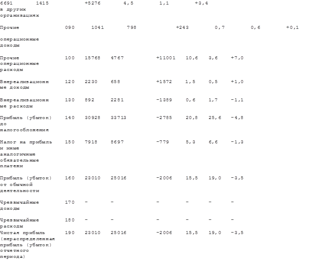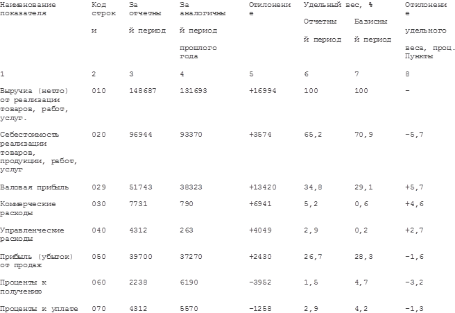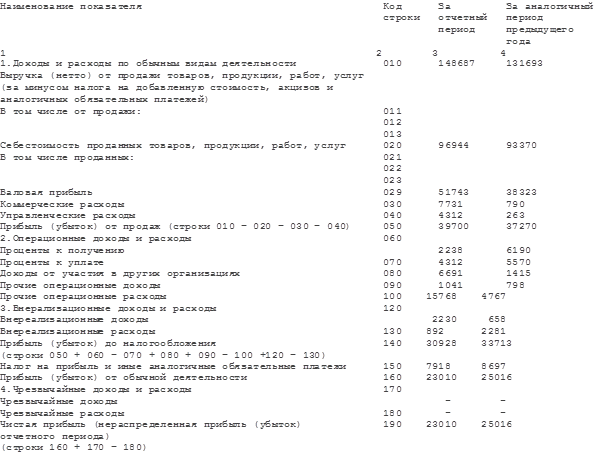 3. АНАЛИЗ ОТЧЕТА О ПРИБЫЛЯХ И УБЫТКАХ 3.1 Содержание "Отчета о прибылях и убытках" Согласно Положению по бухгалтерскому учету "Бухгалтерская отчетность организации" (ПБУ 4/99) отчет о прибылях и убытках должен характеризовать финансовые результаты деятельности организации за отчетный период. В отчете о прибылях и убытках доходы и расходы должны показываться с подразделением на обычные, операционные, внереализационные и чрезвычайные (ПБУ 9/99 и ПБУ 10/99).Пример отчета представлен в Приложении 10.По статье "Выручка (нетто) от продажи товаров, продукции, работ, услуг (за минусом налога на добавленную стоимость, акцизов и аналогичных обязательных платежей)" показывается выручка от продажи готовой продукции (работ, услуг), являющаяся доходом от обычных видов деятельности, с учетом скидок (накидок), суммовых разниц, изменений условий договора. Расчетов неденежными средствами и т.п. В отчете о прибылях и убытках должна быть отведена особая роль доходам от обычных видов деятельности в случае их существенности или без знания, о которых заинтересованными пользователями невозможна оценка финансовых результатов деятельности организации. Такие доходы подлежат отражению обособленно в виде расшифровки к статье "Выручка (нетто) от продажи товаров, продукции, работ, услуг (за минусом налога на добавленную стоимость, акцизов и аналогичных обязательных платежей) или в приложении к отчету о прибылях и убытках.По статье "Себестоимость проданных товаров, продукции, работ, услуг" отражаются учтенные затраты на производство продукции, работ, услуг в доле, относящейся к проданным в отчетном периоде продукции, работам, услугам.Валовая прибыль представляет собой разницу между выручкой, отраженной по строке 010, и себестоимостью проданных товаров, продукции, работ, услуг, отраженных по строке 020.По статье "Коммерческие расходы" показывают затраты, связанные со сбытом продукции, учитываемые на счете 44 "Расходы на продажу", относящиеся к проданной продукции (работам, услугам).По статье "Управленческие расходы" отражаются расходы, учитываемые на счете 26 "Общехозяйственные расходы", представляющие собой расходы по управлению организацией в целом и обычно являющиеся постоянными.Прибыль (убыток) от продаж представляет собой разницу между выручкой от продажи товаров (продукции, работ, услуг) и суммой себестоимости проданных товаров, продукции, работ, услуг, коммерческих расходов и управленческих расходов.В разделах "Операционные доходы и расходы" и "Внереализационные доходы и расходы" отражаются доходы и расходы, признанные в бухгалтерском учете как прочие в соответствии с ПБУ 9/99 и ПБУ 10/99.По статье "Проценты к получению" отражаются операционные доходы в сумме причитающихся в соответствии с договорами доходы процентов по облигациям, депозитам, за предоставление в пользование денежных средств организации и другие подобные доходы.Доходы, связанные с участием в уставных капиталах других организаций и подлежащие получению по сроку в соответствии с учредительными документами, отражаются по статье "Доходы от участия в других организациях" раздела "Операционные доходы и расходы".По статье "Проценты к уплате" отражаются операционные расходы в сумме причитающихся в соответствии с договорами к уплате процентов по облигациям, за предоставление кредитов, займов и т. 