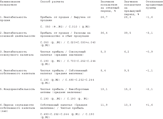 гдеЭф – экономическая эффективность;Э - экономический эффект;З - ресурсы или затраты.Коэффициенты рентабельности представляют собой частный случай показателей эффективности. В данном случае в качестве показателя экономического эффекта избирается один из показателей прибыли. В научной и учебной литературе приводится множество коэффициентов рентабельности в зависимости от того, с чьей позиции пытаются оценить эффективность деятельности организации, поэтому в мировой практике отсутствует какой-либо универсальный показатель рентабельности. Кроме того, сам термин "рентабельность" иногда переводят как доходность. Достоинством показателей рентабельности следует считать устранение влияние инфляции при сопоставлении показателей за ряд периодов при условии сохранения методики формирования базовых данных для их расчета. Возможная система показателей рентабельности представлена в Приложении 12.Анализируя информацию, приведенную в Приложении 12, можно сказать, что все представленные показатели имеют отрицательную динамику. Показатель "рентабельность продаж", отражающий размер прибыли, приходящейся на рубль реализованной продукции, снизился на 1,6 процентных пункта. Рентабельность основной деятельности, показывающая, сколько прибыли от продаж приходится на рубль расходов, снизилась на 3,1 процентных пункта. Такое снижение против показателя "рентабельность продаж" обусловлено значительным ростом управленческих и коммерческих расходов по сравнению с предыдущим периодом.Показатель "период окупаемости собственного капитала", являющийся обратным показателю "рентабельность собственного капитала", дающий возможность рассчитать, сколько лет необходимо для окупаемости вложений в данную организацию, также обнаружил отрицательную динамику. Показатели отчетного периода свидетельствуют, что при сохранении основных параметров развития, собственный капитал организации окупится за 11,9 лет против 10,3 лет по данным отчетности предыдущего периода. 3.4 Влияние учетной политики на формирование показателей отчета о прибылях и убытках На показатели отчета о прибылях и убытках влияют элементы учетной политики, приведенные в Приложении 7. В первую очередь речь идет о показателе "Валовая прибыль". Элементы учетной политики оказывают влияние на величину себестоимости проданных товаров, продукции, работ в сторону увеличения или уменьшения. Так, в условиях инфляции использование метода ЛИФО при определении себестоимости списываемых на производство материальных ресурсов влечет за собой увеличение себестоимости продукции, работ, услуг отчетного периода. Использование метода ФИФО – напротив снижение себестоимости продукции, работ, услуг отчетного периода. Хотя, из этого правила может быть исключение, если, например, в организации, применяющей метод ЛИФО в конце отчетного периода поступает значительная партия сырья от основного поставщика по ценам ниже предыдущих закупок. Таким образом, анализировать информацию, представленную в отчетности, необходимо после серьезного изучения применения вариантов учетной политики конкретной организации.В соответствии с учетной политикой организации управленческие расходы, учитываемые на счете 26 "Общехозяйственные расходы", могут списываться на счет 20 "Основное производство" с целью исчисл