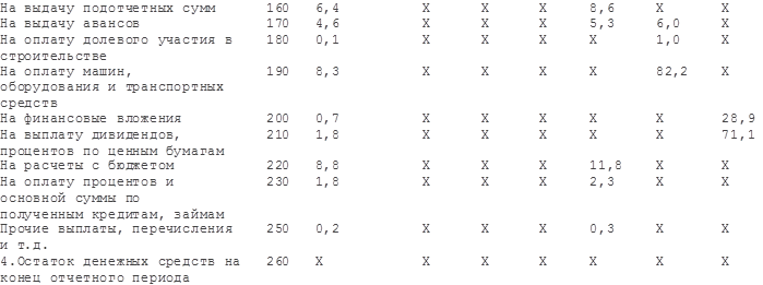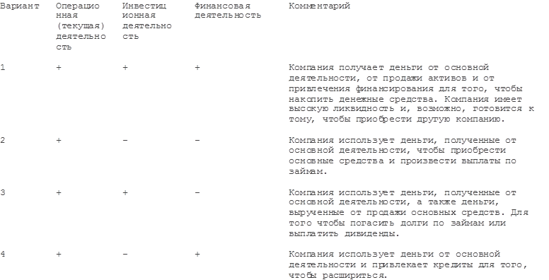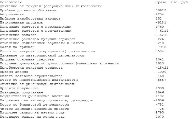 4.3 Анализ отчета о движении денежных средств, составленного косвенным методом При косвенном методе финансовый результат преобразуется с помощью ряда корректировок на величину изменения денежных средств за период.Все корректировки можно подразделить на следующие группы: корректировки на величину неденежных статей; корректировки, необходимые в связи с переходом от метода начисления к кассовому методу; корректировки, связанные с изменениями оборотных активов; корректировки, связанные с изменениями краткосрочных обязательств.Объяснить формат отчета, основанный на косвенном методе, может помочь определенное преобразование балансового уравнения. Активы = Обязательства + Собственный капиталДенежные средства + Неденежные активы = Обязательства + Собственный капиталДенежные средства = Обязательства + Собственный капитал – Неденежные активы Таким образом, на первом этапе осуществляется корректировка на величину неденежных статей. В качестве примера таких неденежных статей можно привести амортизацию внеоборотных активов; финансовый результат от выбытия внеоборотных активов.Корректировка, связанная с переходом от метода начислений к кассовому методу, позволяет "очистить" финансовый результат от суммы выручки, по которой еще не поступили денежные средства от покупателей и заказчиков. Действительно, отчет о движении денежных средств – это единственный отчет в международной практике, составляемый кассовым методом.В части влияния изменения оборотных активов можно сказать, что как правило, величина, на которую увеличились оборотные активы, вычитается из показателя финансового результата и, наоборот, величина, на которую уменьшились оборотные активы, прибавляется к финансовому результату. Так, рост дебиторской задолженности уменьшит показатель прибыли на ту же самую величину, поскольку реальное поступление денежных средств меньше выручки, отраженной в отчете о прибылях и убытках.Корректировка прибыли на изменение краткосрочных обязательств осуществляется аналогичным образом, только сумма, на которую увеличиваются краткосрочные обязательства, прибавляются к прибыли, а сумма, на которую уменьшаются краткосрочные обязательства, вычитается. Так, рост кредиторской задолженности означает, что было израсходовано меньше средств, чем отражено в соответствующей статье отчета о прибылях и убытках.Пример отчета о движении денежных средств, составленный косвенным методом, представлен в Приложении 15. Как видно из приведенного примера, в данном случае в формате отчета о движении денежных средств, построенном косвенным способом, принципиально меняется только раздел о текущей деятельности. Данная форма позволяет делать выводы о степени влияния приведенных показателей на показатель прибыли до налогообложения. Понятно, что суммы с отрицательным знаком оказывают, соответственно, снижающее действие. Таким образом, данная форма сама по себе является аналитический формой, позволяющей делать выводы без расчета каких-либо дополнительных показателей. 4.4 Оценка результатов анализа денежных средств Для результатов анализа отчета о движении денежных средств целесообразно использовать таблицу, приведенную в учебном пособии "Учет по международным стандартам" под редакцией Л.В. Горбатовой. ("Учет по международным стандартам"