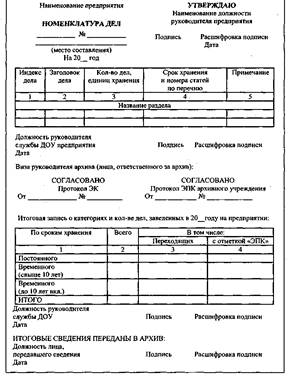 - утверждение проекта номенклатуры дел руководителем предприятия.