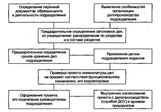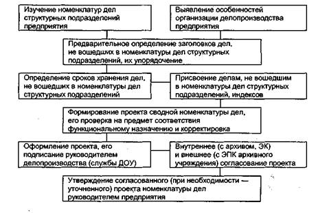 Работа по составлению номенклатур дел, как структурных подразделений, так и учреждения в целом координируется делопроизводственной службой и, как правило, включает изучение их организационной структуры и направлений, а также комплекса документов, на основании которых будут формулироваться наименования дел и определяться принципы их формирования. В номенклатуры дел включаются заголовки дел для группировки документов с грифом «Для служебного пользования», справочные картотеки.