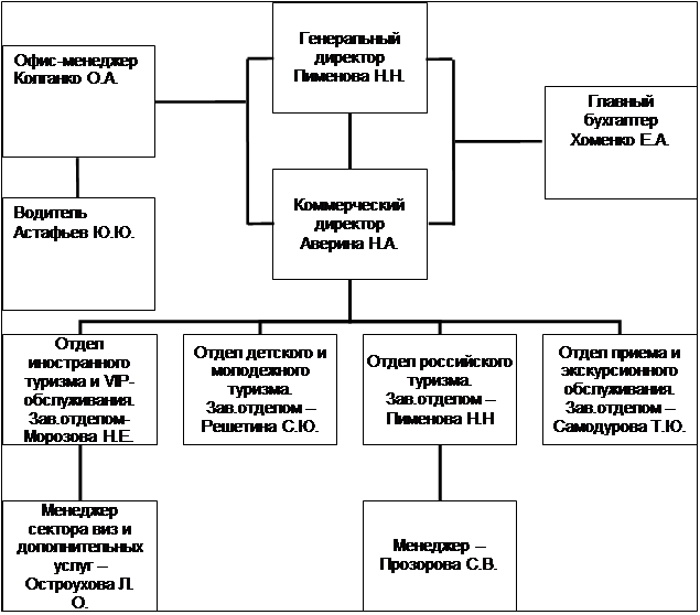 Вся деятельность фирмы зависит от успешной работы отделов этой фирмы. Кроме основных отделов функционируют еще 2 отдела: визовый и бухгалтерский.