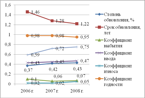 Положительная динамика коэффициента обновления в 2007 и 2008 годах свидетельствует о больших объемах поступления основных средств на баланс предприятия, что является положительной тенденцией, так как данный коэффициент характеризует достаточный уровень обновления фондов для нормальной деятельности рассматриваемого предприятия. Снижение в 2007 и 2008 годах по сравнению с 2006 годом значения коэффициента выбытия говорит о довольно большой доле выбывших основных средств в общей структуре фондов. Это связано с тем, что предприятие продало устаревшее нерентабельное или низкорентабельное оборудование, которое утратило свою актуальность при закупленном новом оборудовании. Снижение срока обновления с 2006 по 2008 годы является положительным сдвигом в структуре движения основных средств. Так, срок обновления основных фондов ООО «Тройка-ресурс» за период с 2006 по 2008 год снизился примерно на 0,24 или на 3 месяца. Коэффициент прироста показывает долю прироста основных средств в стоимости их на начало года. Данные расчетов показывают, что за рассмотренный период этот показатель увеличился с 2006 по 2008 годы с 0,59 до 0,75, что говорит о незначительном, но росте поступлений основных средств за данный период. А в 2007 году данный коэффициент составлял 0,72, что также связано с обновлением основных фондов предприятия в этом периоде. Коэффициент выбытия основных средств в 2008 году по сравнению с 2006 годом имел тенденцию к снижению с 0,10 до 0,07. Данный факт является положительным моментом в сфере управления внеоборотными активами ООО «Тройка-ресурс». При этом присутствует также такой позитивный момент как то, что коэффициент ввода увеличился с 0,43 до 0,47.