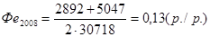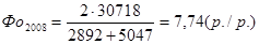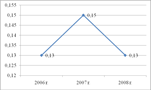 Фондоемкость в 2007 году имела тенденцию к увеличению, благодаря незначительному повышению выпуска продукции при довольно значительных темпах роста среднегодовой стоимости основных производственных фондов ООО «Тройка-ресурс». Например, за 2008 год на 1 рубль продукции приходится 0,13 рубля основных средств. Уменьшение рассматриваемого показателя в сравнении с 2007 годом (0,02 р./р.) конечно является положительной тенденцией. Получен данный результат в основном из-за значительного увеличения выручки от реализации.