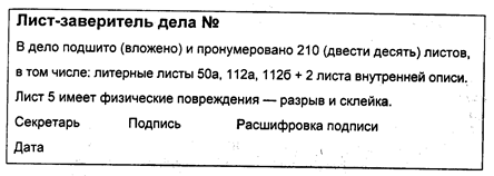 Для учета количества листов в делах постоянного и временного (свыше 10 лет) хранения составляется заверительная надпись. Она составляется на отдельном листе-заверителе, который располагается в конце каждого дела. В ней цифрами и прописью указывается число пронумерованных листов дела и отдельно через знак «+» — число листов внутренней описи, если она есть.