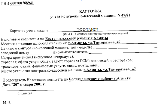 В целях защиты населения от приобретения недоброкачественных товаров (услуг) и предотвращения сокрытия доходов от налогообложения, в соответствии с Постановлением правительства Республики Казахстан №1034 от 6 августа 2001г. утверждены Правила применения контрольно-кассовых машин с фискальной памятью, согласно которым налогоплательщики (все юридические лица независимо от форм собственности) обязаны проводить денежные расчеты с потребителями, осуществляемые при торговых операциях или оказании услуг, посредством наличных денег, платежных банковских карточек, чеков с обязательным применением контрольно-кассовых машин и выдачей контрольного чека на руки потребителю [4].