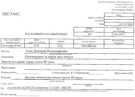 | 2 | Расх. орд. 563 | Расход: Компенсация за неисп труд отпуск Усов Дмитрий Владимирович (Типография ТАиС) |