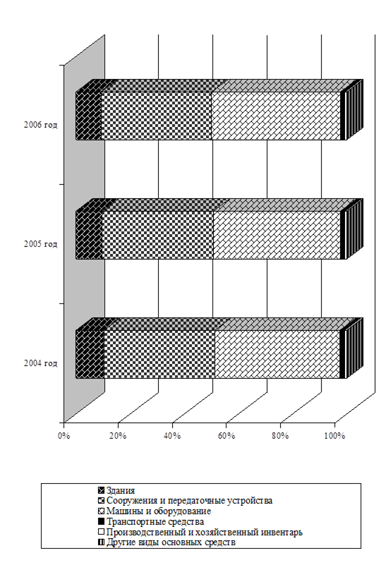 Предприятие располагает большим комплексом заводских помещений, машин и оборудования. Анализируя основные средства на предмет наличия, структуры и движения можно заключить следующее: за анализируемый период наблюдается стабильное увеличение основных средств предприятия. Темп роста в 2005 году составил 106%. В 2006 году темп роста составил 122% относительно базового 2004 года. Анализ структуры основных средств предприятия ОАО «АвтоВАЗагрегат» позволяет сделать вывод о стабильности структуры основных средств за ряд анализируемых лет с 2004 по 2006 год. Наибольший удельный вес в общей структуре основных средств предприятия занимают сооружения и передаточные устройства -более 40% и машины и оборудование –более 46%. Около 10% в общей структуре –это здания. Транспортные средства предприятия составляют немногим меньше 2%. Незначительная часть в общей структуре основных средств составляют производственный и хозяйственный инвентарь и другие виды основных средств. За истекший период доля активной части основных средств практически не изменилась и составила 48,65% на начало периода и 49,27% на конец анализируемого периода. Коэффициент износа за анализируемый период повысился с 38% до 39%, т.е. Темп роста составил 103%. Как в 2005 , так и в 2006 году предприятие планомерно обновляет 13% основных средств. Если эта тенденция сохранится, то основные средства будут полностью обновлены через 2,33 года. Выбытие основных средств происходило пропорционально их обновлению. К концу года выбыло 15% имеющихся основных средств, при этом обновилось 13% основных средств, поэтому коэффициент прироста составляет 12%. Это говорит о том, что предприятие за истекший период накопило основные средства.