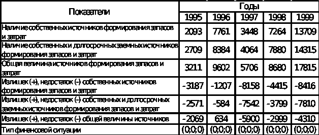 Анализ обеспеченности запасов и затрат источниками формирования позволяет судить о кризисном финансовом состоянии. Недостаток источников формирования запасов и затрат в 1999 г. составил 4310 руб.