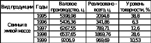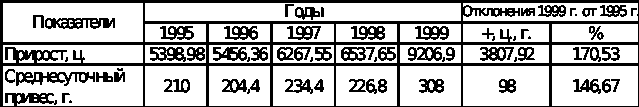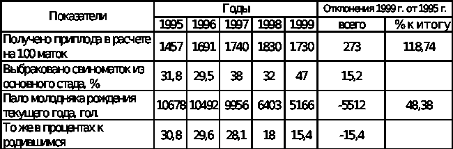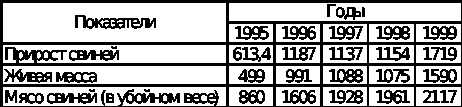 Анализ производства и себестоимости свинины за период 1995 – 1999 гг. показал, что численность поголовья свиней на откорме увеличилась на 611 гол или 8,4%. Рост продуктивности свиней за рассматриваемый период составил 12,3 кг в расчёте на 1 гол. или 11%. Более чем в 2 раза сократился падеж получаемого приплода, что является результатом хорошей организации воспроизводства стада. Эти факторы повлияли на рост валового производства свинины на 3807,92 ц. к. ед.