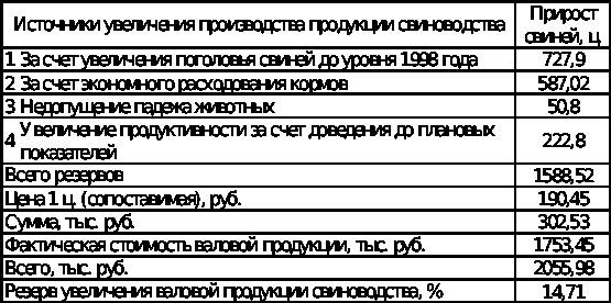 Увеличение поголовья свиней на откорме до уровня предшествующего года даст дополнительный выход продукции в размере 797,9 ц; эффективное использование корма, не допуская перерасхода – 587,02 ц; недопущение падежа животных – 50,8 ц и доведение до плановых показателей продуктивности свиней – 222,8 ц.