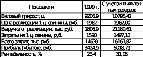 В целом резерв снижения себестоимости на валовой прирост, включая резерв по производству свинины обеспечит предприятию прибыль в размере 5018,79 рублей, рентабельность производства составит 31,05 %.
