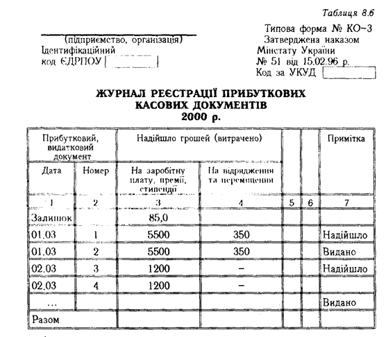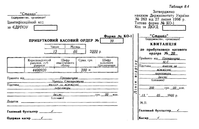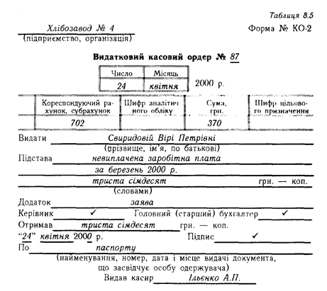Надходження і видачу грошей з каси підприємства оформлюють прибутковими й видатковими касовими ордерами, які виписує бухгалтерія, за формами № КО-1 і № КО-2 (табл. 8.4, 8.5).