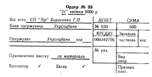 - виписка бухгалтерією на кожну окрему касову операцію прибуткових і видаткових ордерів, додержання послідовності в нумерації та реєстрації цих коштів у реєстрі й передачі їх для виконання касирові;