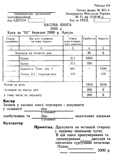 На підприємстві ведеться тільки одна Касова книга (типова форма № КО-4) в національній валюті, в якій касир відображає готівку і рух грошей у касі (форма наведена у табл. 8.8). Записи у Касовій книзі здійснюються за кожним Прибутковим і Видатковим ордером. Але якщо в організації є інші види валют, крім національної, то Касові книги відкриваються на кожну валюту окремо.