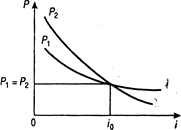Сравнение платежей предполагает использование некоторой процентной ставки, и, следовательно, результат зависит от выбора ее величины. Однако, что практически весьма важно, такая зависимость не столь жестка, как это может показаться на первый взгляд. Допустим, что сравниваются два платежа S1 и S2 сроками n1 и n2 , измеряемыми от одного момента времени, причем S1 < S2 и n1 < n2. Их современные стоимости Р1 и Р2 в зависимости от размера процентной ставки показаны на рис. 3.1.