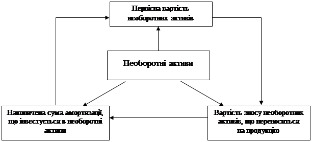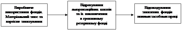 Особливості відтворення основних фондів визначаються низкою характерних ознак, до яких відносяться: поступовий перенос вартості основних фондів на вартість виготовленої продукції; рух споживчої вартості і вартості; оборот вартості фондів; часткове відтворення вартості в готовій продукції та її нагромадження в грошовій формі; поновлення основних фондів у матеріально-натуральній формі через більш-менш тривалі періоди часу, що створює можливість маневрування засобами амортизаційного фонду (рис. 1).
