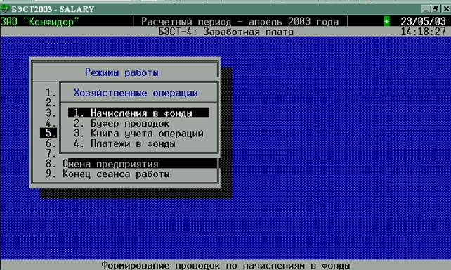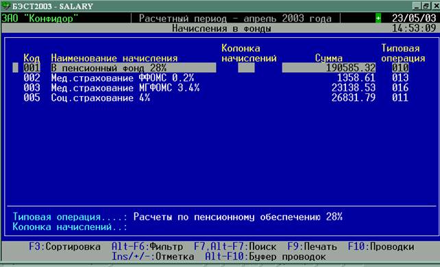 Для расчета начислений платежей в фонды и формирования проводок войдите в режим “Хозяйственные операции” , пункт “Начисления в фонды” (Рисунок 5). На экране появится список начислений в фонды (Рисунок 6).